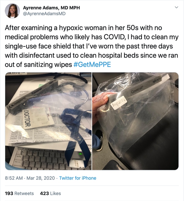 纽约市外科医师Cornelia Griggs上传了自己的作业相片。她只戴着一个薄薄的医用口罩。她写道,“假如我的孩子们在这场疫情中失去了我,我期望他们知道他们的母亲现已尽力尽责了。#给我防护用品#”。