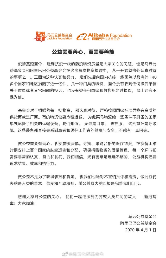 "马云公益基金会"表明,基金会关于捐献的每一批物资,都认真对待,严厉依照国家标准寻觅有资质的供货商或是厂商。