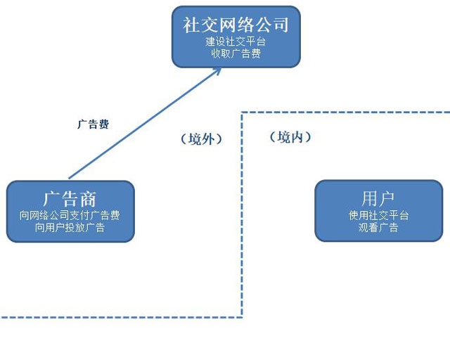 下面咱们以交际网络为例扼要解释一下为什么美国网络公司在欧洲不交税。如下图,假定境外交际网络渠道建立交际网络软件供境内用户运用,一起在软件上投进广告,从境外的广告商那里收费,全部现金流都是在境外发作。境内尽管用户运用软件观看广告可是并没有为任何境内公司带来收入,所以也就天然没有交税了。