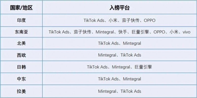 在区域性商场,我国广告途径的体现更为亮眼,其间东南亚区域增加指数榜单中我国广告途径数量最多,占有8席。在印度、东南亚等我国手机厂商商场占有率较高的区域,小米、OPPO在非游戏使用分发方面有着较好的体现,进入了该区域非游戏使用实力榜单Top10。