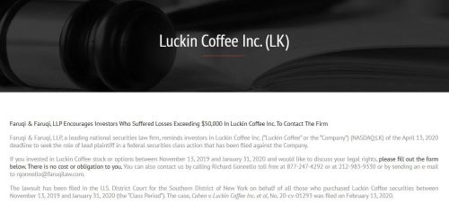 加州的GPM律所、 Schall律所,纽约州的Gross律所、Faruqi律所、Rosen律所和Pomerantz律所等均表明,在2019年11月13日至2020年1月31日间购买过瑞幸咖啡股票的投资者假如企图追回丢失,能够与律所联络,2020年4月13日是首席原告截止日期。