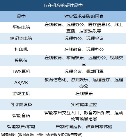 结合中金研报与商场研究机构IDC于2月20日至3月25日发布的系列陈述,36氪概括了如下受疫情影响或许发生新时机的首要硬件品类: