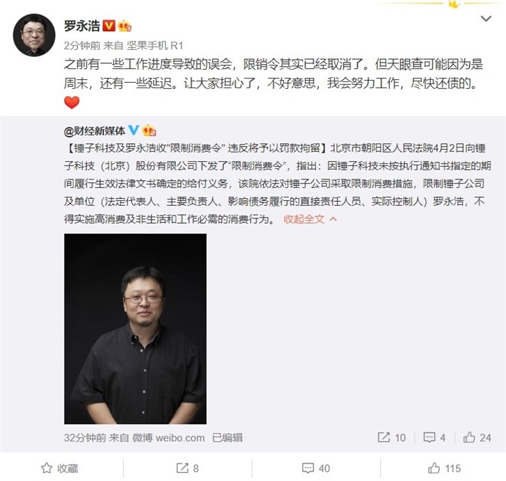 对此罗永浩刚刚在微博回应称,之前有一些作业进度导致的误解,限销令其实现已撤销了。但天眼查或许由于是周末,还有一些推迟,“让我们忧虑了,不好意思,我会努力作业,赶快还账的。”