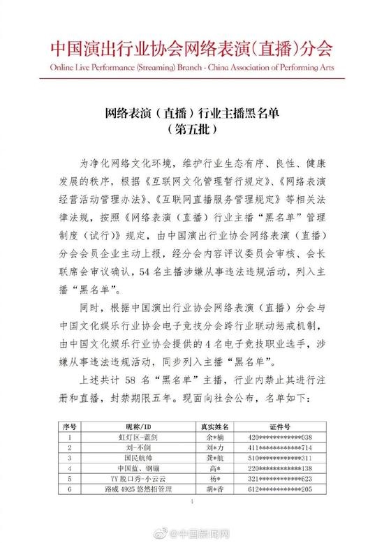 我国扮演行业协会网络扮演(直播)分会4月7日向社会发布第五批主播黑名单,共58名。其间,54名主播涉嫌从事违法违规活动,4名电子竞技工作选手涉嫌从事违法违规活动。被列入黑名单的主播将在行业界制止注册和直播,封禁期限5年。