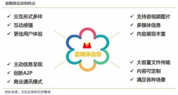 安信证券认为,5G带来大带宽,低延迟以及大容量特性让文本短信升级为集手机通讯录、图片、声音、视频、IM,公众号为一体的富媒体信息,而富媒体信息也将成为新的流量入口。
