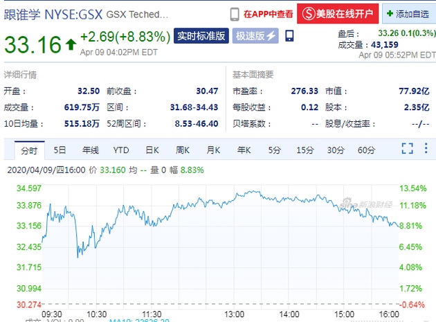 新浪科技讯 北京时间4月10日清晨音讯,周四收盘,跟谁学(NYSE:GSX)股价大涨8.83%,报33.16美元。