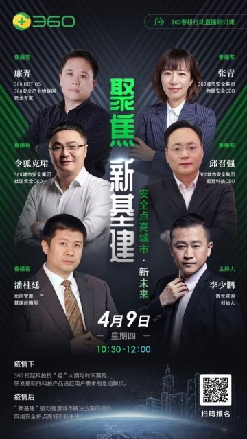 4月9日,以聚集新基建,安全点亮城市新未来为题的一场360春耕举动系列线上研讨顺畅举行。北向智库首席经略师潘柱廷、360城市安全集团视觉科技CEO邱召强、360城市安全集团社区安全CEO令狐克珺、360城市安全集团物联安全CEO张青、360 IIoT OS /360安全工业物联网安全专家廉羿担任本期活动春播客,数世咨询创始人李少鹏担任主持人。