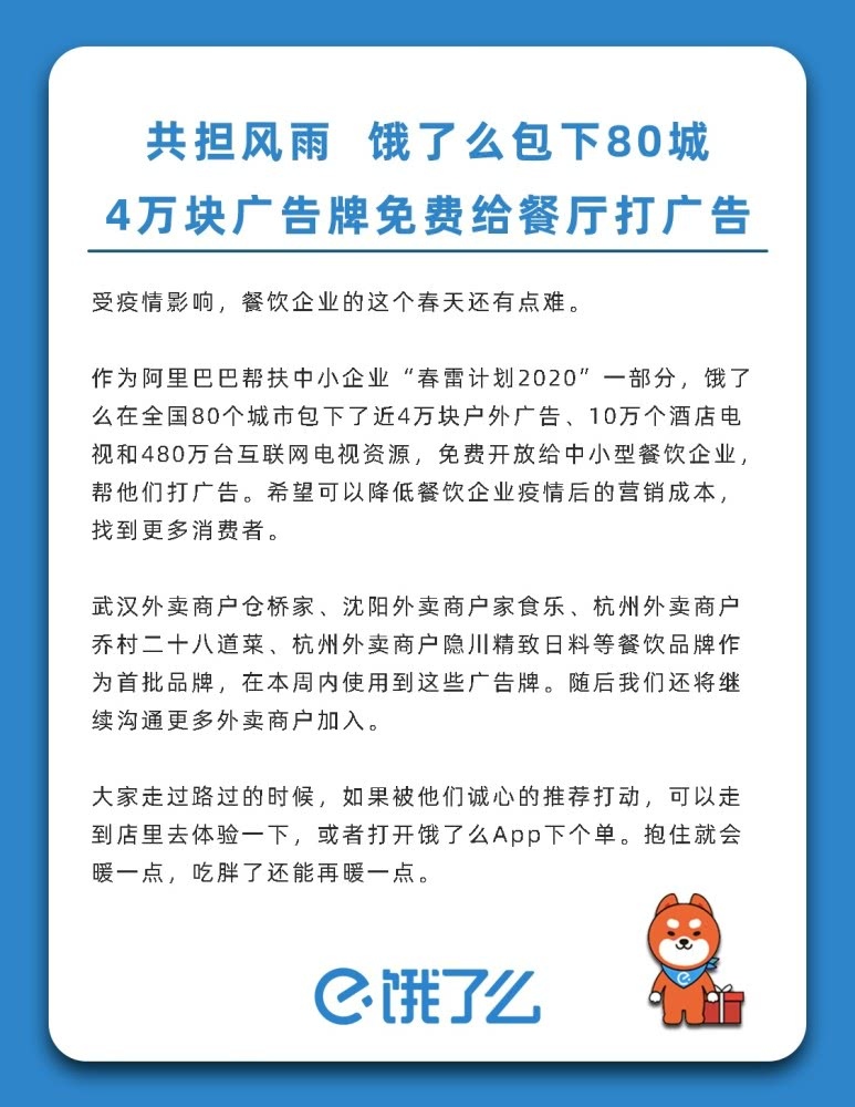 4月13日,饿了么宣告在全国80个城市包下了近4万块户外广告、10万个酒店电视广告位和480万台互联网电视资源,悉数免费开放给各地中小餐饮商家,帮他们播映广告。