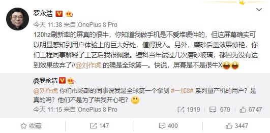 4月14日,一加宣布与罗永浩达成合作,将于4月16日20:30在罗永浩抖音直播间为用户带来一加 8 系列新品直播与闪购活动。此前罗永浩与一加科技 CEO 刘作虎在微博上互动频繁,罗永浩最新的微博小尾巴也都是一加8 Pro,并连发数条微博为一加8系列新品预热。对于双方的合作,很多微博用户表示“喜闻乐见”,十分期待罗永浩能够在直播间详谈一加 8 系列新品的屏幕体验与亮点。