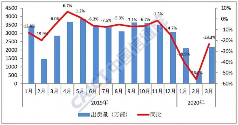国内手机商场整体出货量。2020年3月,国内手机商场整体出货量2175.6万部,同比下降23.3%,其间2G手机69.8万部、4G手机1484.4万部、5G手机621.5万部。2020年1-3月,国内手机商场整体出货量4895.3万部,同比下降36.4%,其间2G手机108.6万部、4G手机3380.7万部,5G手机1406.0万部。