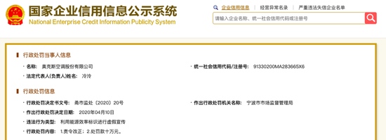4月10日,国家企业信用信息公示体系显现,浙江省宁波市商场监督管理局对“奥克斯空调股份有限公司使用动力功率标识进行虚伪宣扬”一案做出了行政处分,内容包含责令改正与处分款十万元人民币。