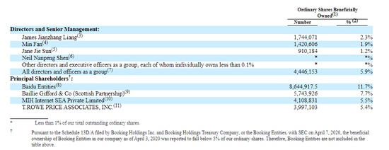 4月14日上午音讯,携程在最新提交给美国证券委员会的文件中更新了公司的股权结构。最新股权结构显现,百度的持股份额为11.7%,虽低于从前19%的持股份额,但仍是携程榜首大股东。第二大股东Baillie Gifford & Co (Scottish Partnership)持股份额为7.7%;别的两家组织MIH Internet SEA Private Limited和T.ROWE PRICE ASSOCIATES持股份额分别为5.5%和5.4%。