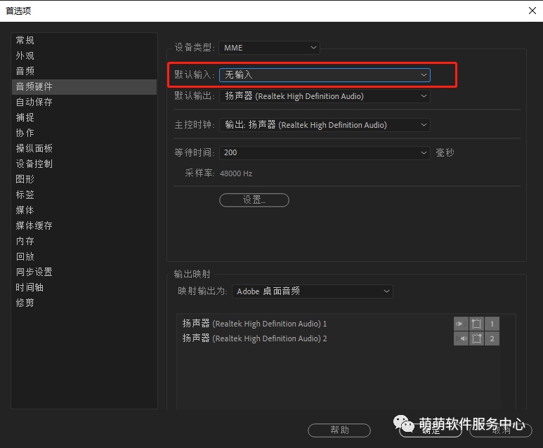 翻开PR软件首选项,挑选左边音频硬件,之后将默许输入改为无输入,点击确认即可处理
