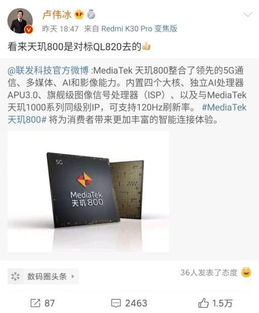 昨日晚间,卢伟冰转发了联发科关于天玑800的微博,并表明天玑800是对标麒麟820去的,这个意思莫非是红米要首发天玑800了?