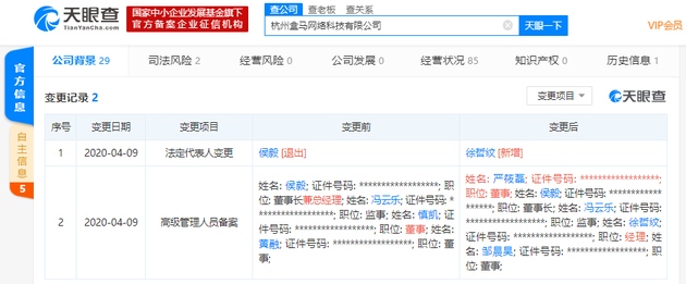 新浪科技讯 4月16日下午音讯,天眼查多个方面数据显现,4月9日,杭州盒马网络科技有限公司发作工商改变,创始人侯毅卸职公司法定代表人、总经理一职,均由徐哲纹接任,慎凯卸职公司董事,由严筱磊接任。