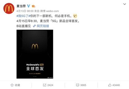 在吊足了所有人胃口之后,麦当劳4月15日正式推出了新品——5G炸鸡。一夜间,快餐品牌麦当劳和通信技术5G竟然强行产生了某种说不清道不明的关系。
