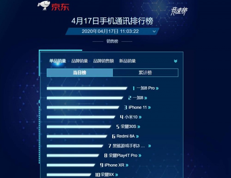 4月17日到11点03分当日品牌销量榜一加也是冠军,这个就十分有阐明力。因为一加今日仅有两款机型开售,其它品牌的机型最少的也有十多款,多的到达几十款。一加仅凭两款机型就能成为品牌销量冠军,可想而知一加8系列今日卖了多少。