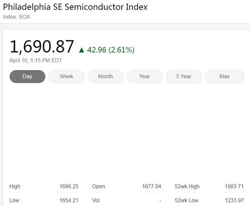 费城半导体指数周四上涨42.96点,或2.61%,报1690.87点。