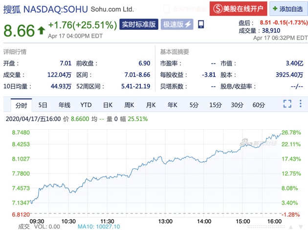 新浪科技讯 北京时间4月18日音讯,周五开盘后,搜狐股价一路上涨,到收盘,搜狐股价暴升25.51%,报8.66美元。