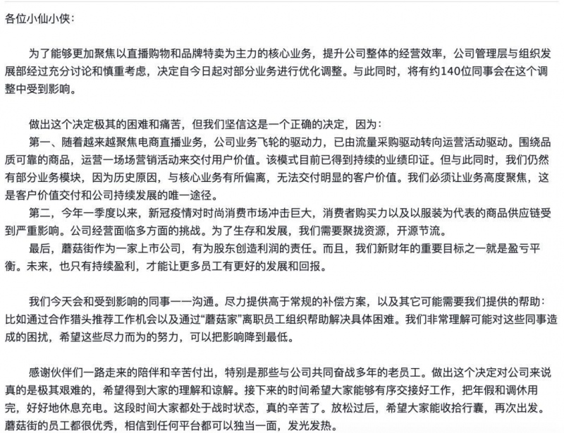 内部信中提及,本轮裁人首要对部分事务进行优化调整,裁撤部分因前史原因遗留下来的事务,尤其是与其现在中心事务——电商直播违背的部分。