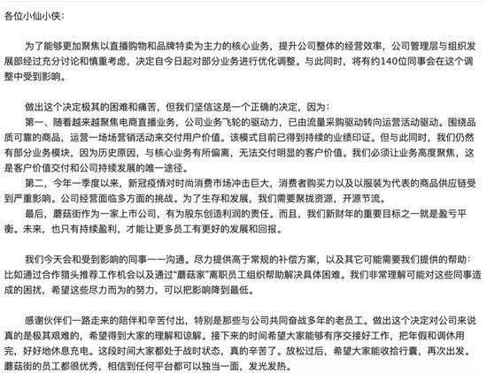 蘑菇街创始人陈琪宣告裁人内部信内部信中,陈琪提及,本轮裁人主要对部分事务进行优化调整,裁撤部分因前史原因遗留下来的事务,尤其是与其现在中心事务——电商直播违背的部分。脉脉等渠道数位认证为蘑菇街职工的用户也供给了更多的裁人细节。一位匿名信源称,除了陈琪所提及的部分事务线被砍:“层级高、入职时间短,但对事务没什么奉献,满意以上两个,根本被裁”。此外,匿名信源还表明,本轮裁人北京地区是重灾区。