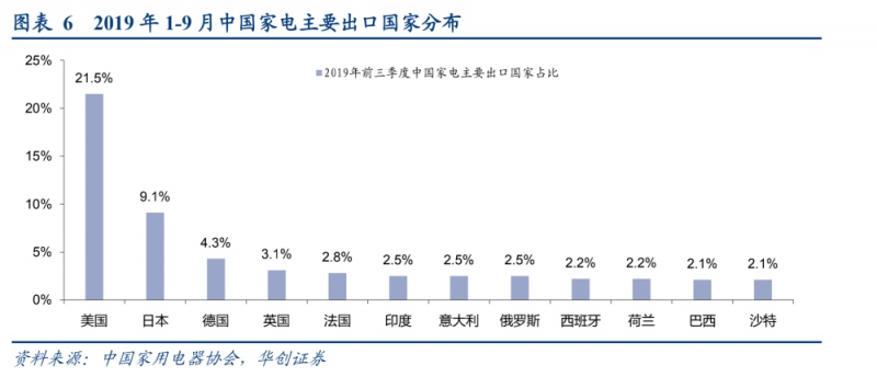 传统大家电卖不出国门是一个很严重的问题。去年,中国出口的大部分家电卖给了美国(21.5%),日本第二(9.1%),然后德国、 英国等各占比 5% 左右。但这些国家目前都因疫情进入了戒备状态。