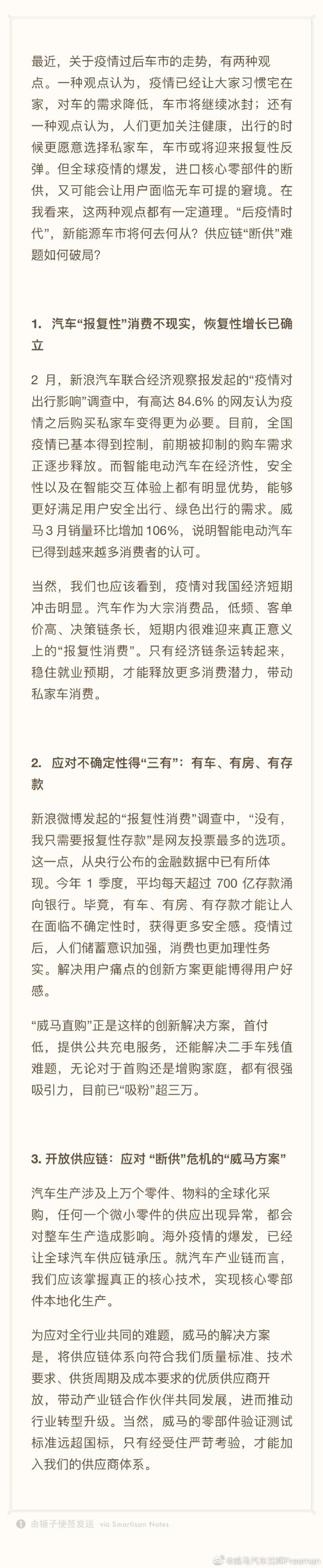 新浪科技讯 4月18日下午音讯,威马轿车创始人、CEO沈晖在其个人微博上发文表明,轿车作为大宗消费品,低频、客单价高、决议计划链条长,短期内很难迎来真实意义上的“报复性消费”。只要经济链条工作起来,稳住工作预期,才干开释更多消费潜力,带动私家车消费。