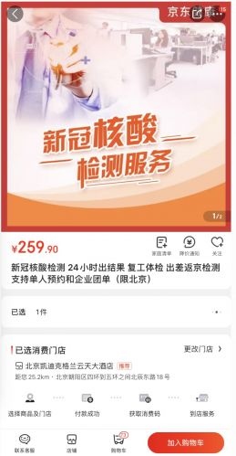 据介绍,用户经过京东APP查找核酸检测,即可进入相关页面,购买及预定检测服务。