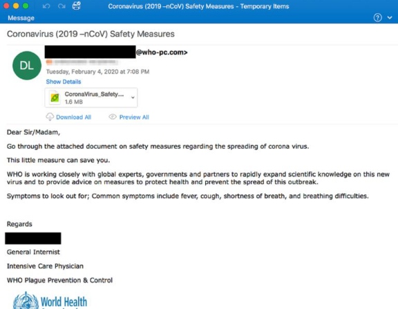 多个方面数据显现,有关 COVID-19 的歹意邮件进犯数量和频率正在快速添加,从每天一次发展到每天三到四次。运用人们的惊骇和对相关咨询的需求,骗术也从最开端免费赠送口罩和洗手液这样的幌子,晋级到了假扮世界卫生安排或英国政府。