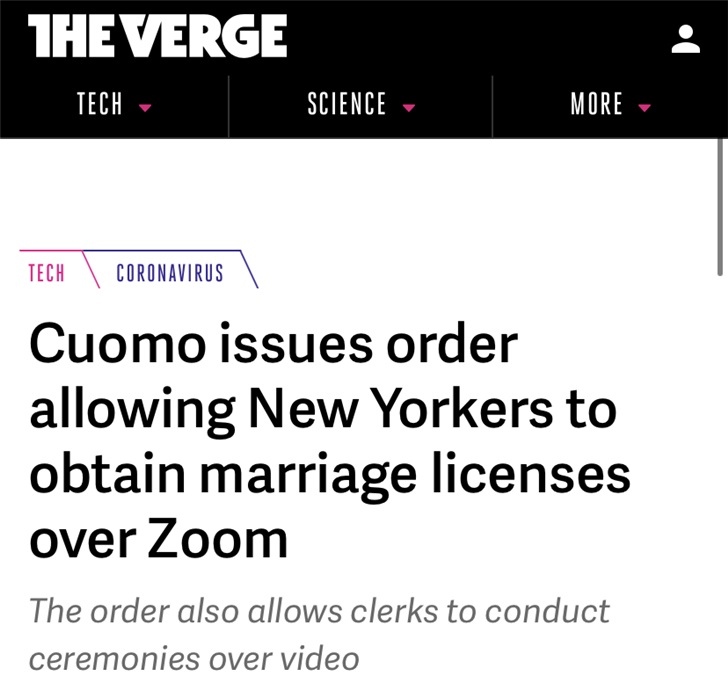 IT之家4月19日音讯据外媒The Verge报导,美国纽约州州长安德鲁·库莫(Andrew Cuomo)周六表明,因为冠状病毒大盛行导致纽约民事部分封闭,纽约州将开端答应长途颁布成婚许可证,就事人员可通过视频掌管典礼。