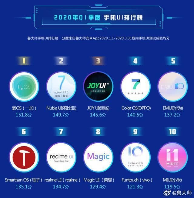据鲁大师给出的排名显现,来自一加的氢OS定制体系排名榜首,越过了150分的门槛。接下来是nubia UI、黑鲨JOY UI、Color OS、EMUI华为……但国内闻名品牌小米的定制体系MIUI却倒数榜首,几乎掉出前十榜单。