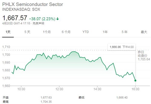 4月21日音讯,据国外新闻媒体报道,美国三大股指周一收跌,费城半导体指数跌落2.23%。
