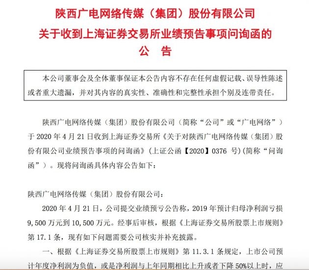 上交所要求广电网络发表本问询函,并于2020年4月28日之前,以书面形式回复我部并对外发表。