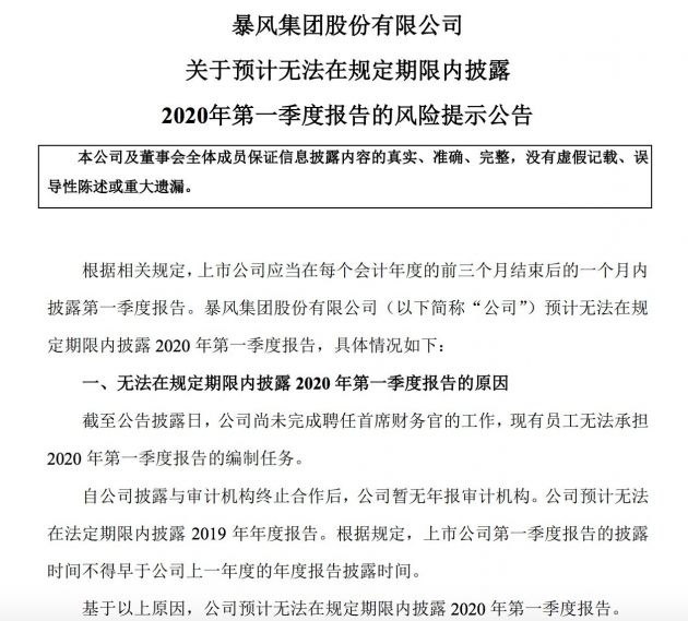 4月21日音讯,暴风集团发布布告称,估计无法在法定期限内发表2019年年度陈述以及2020年第一季度陈述。