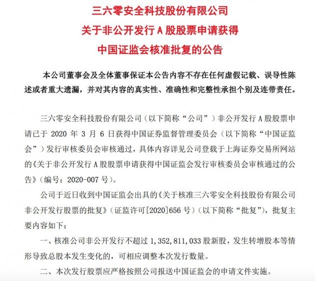 4月21日音讯,三六零发布公告称,于近来收到中国证监会出具的《关于核准三六零安全科技股份有限公司非公开发行股票的批复》。