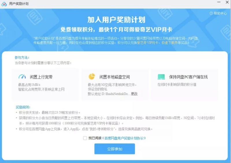 近来,百度网盘因默许敞开一项“用户奖赏(鼓励)方案”而引发争议。这项方案旨在让用户共享少数搁置网络带宽和电脑存储空间,协助百度网盘提高传输速度。参加助力的用户可取得相应的积分奖赏,最快1个月可取得爱奇艺VIP月卡。