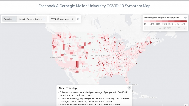 4月20日,美国交际巨子Facebook发布了其首个可以逐县追寻新冠病毒症状的地图,计划在疫情爆发期间每天更新。