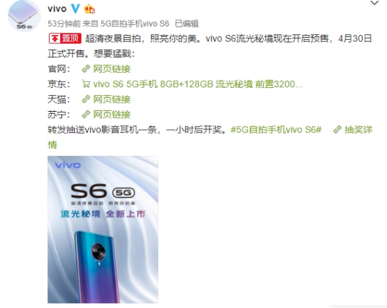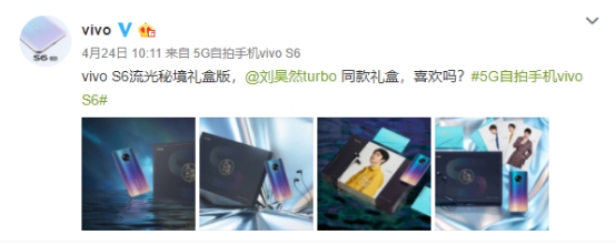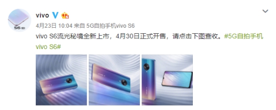 S6流光秘境的KV海报,自4月23日、24日起,vivo官方微博连续3天发布vivo S6流光秘境的相关信息,为新色4月30日正式开售进行预热。