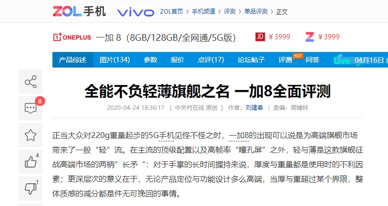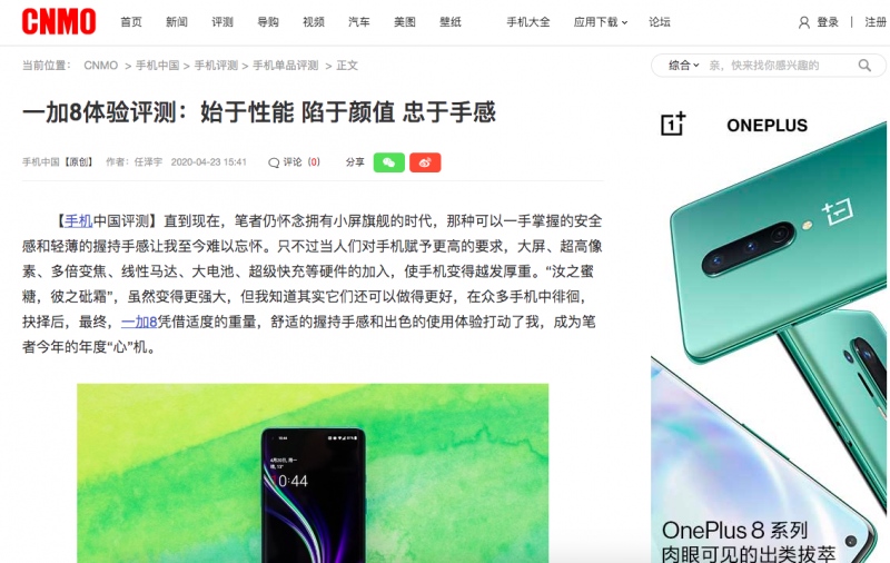 主流手机资讯媒体《手机中国》同样认可一加 8 在保证轻薄的同时带来强悍性能,他们高度赞美道:一加 8 是一款在使用时不会带来任何负担的产品,它在保持原有顶尖硬件性能的基础上,通过技术革新和不断的调整,获得了轻薄的机身和极佳的握持手感,成为5G时代当之无愧的轻薄旗舰。