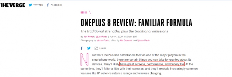 权威科技媒体《The Verge》在深度体验完一加 8 后,简要地指出了一加 8 作为一款轻薄旗舰极具竞争力的优势:(一加 8 )有着出色的屏幕,优异的性能和持久的续航。