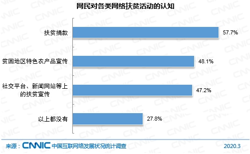 二是经过网络扶贫作业,实在提高广阔网民对脱贫攻坚的认知水平。多个方面数据显现,超越七成网民对网络扶贫相关活动有所了解。到2020年3月,网民在互联网上看到“扶贫捐款”相关联的内容的份额最高,为57.7%;在互联网上看到“贫穷区域特征农产品宣扬”“在交际渠道、新闻网站等上的扶贫宣扬”等相关联的内容的份额分别为48.1%、47.2%。
