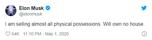 上星期五,马斯克发推特表明,预备出售自己一切的有形财物。“我正在卖掉简直一切的有形财物,”他在推特中写道。“我将不再具有房子。”万万没想到,他并非恶作剧,真的付诸实践。