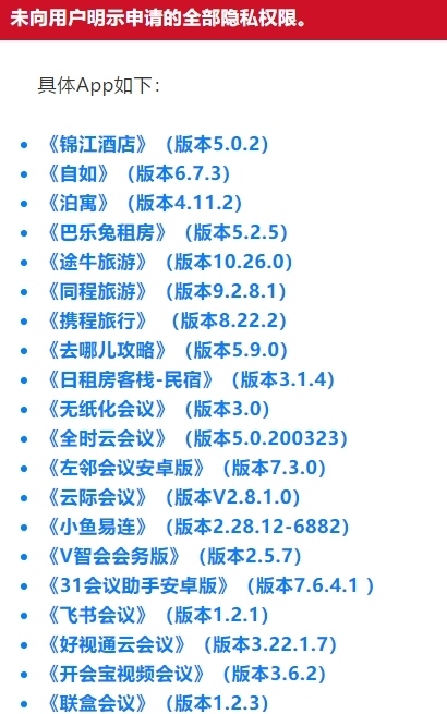 具体来说,在未向用户明示请求的悉数隐私权限的App中,包含了《锦江酒店》《自若》《泊寓》《途牛游览》《同程游览》《携程游览》《去哪儿攻略》《飞书会议》等20款。