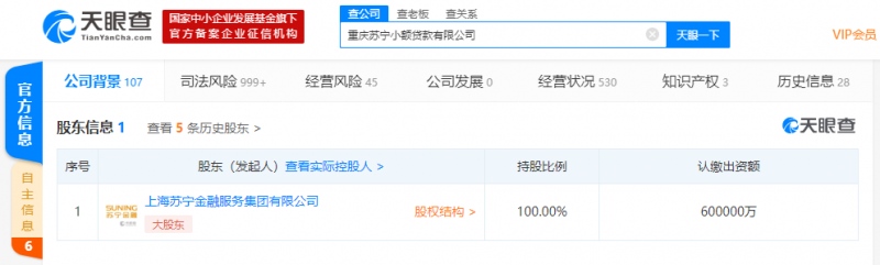 重庆苏宁小额借款有限公司成立于2012年12月,法定代表人为尚姬娟,公司经营范围为一般项目:在全国范围内展开各项借款、收据贴现、财物转让事务,由上海苏宁金融服务集团有限公司全资控股。