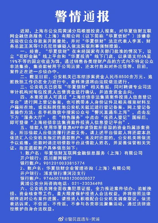 新浪科技讯 5月13日下午音讯,上海市公安局黄浦分局官方微博发布通报,近期,上海市公安局黄浦分局依据出资人报案,对华夏信财互联网金融信息服务(上海)有限公司(以下简称“华夏信财”)涉嫌不合法吸收大众存款案展开查办,并对“华夏信财”法定代表人李某、财务总监王某等12名嫌疑犯依法采纳刑事强制措施。