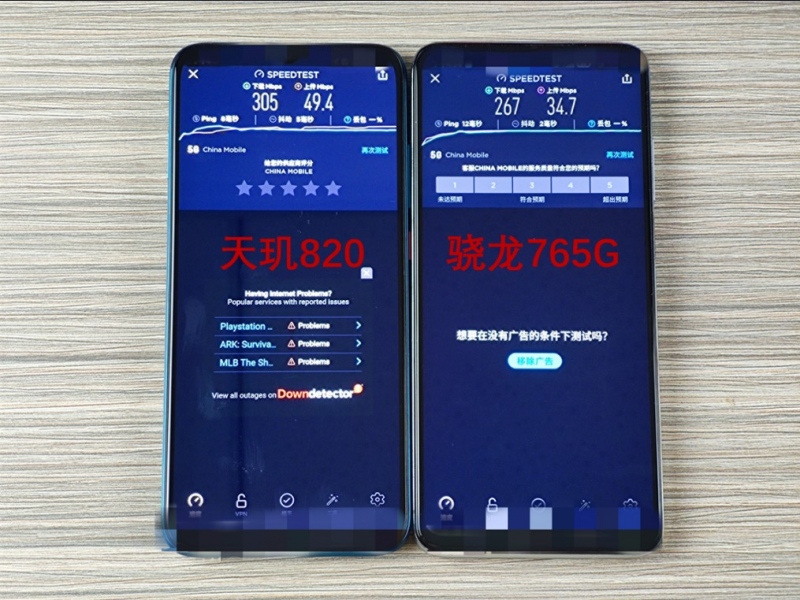 首先是5G速度的测试。通过Speedtest在相同环境、相同运营商条件下的5G实测,可以看到搭载天玑820的Redmi 10X在5G下载及上传速率方面的表现均优于骁龙765G很多。两款芯片都是集成式5G基带,天玑820支持5G双卡双待、5G双载波聚合等技术,因此终端手机的5G用户体验会更好。