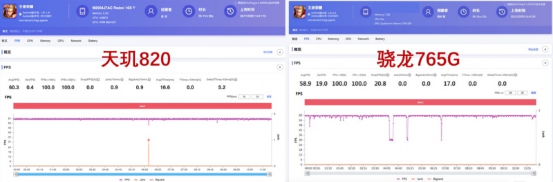以王者荣耀为例,一局游戏结束,可以看到天玑820的帧率表现明显优于骁龙765G,无论是平均帧率还是卡顿次数均保持领先。
