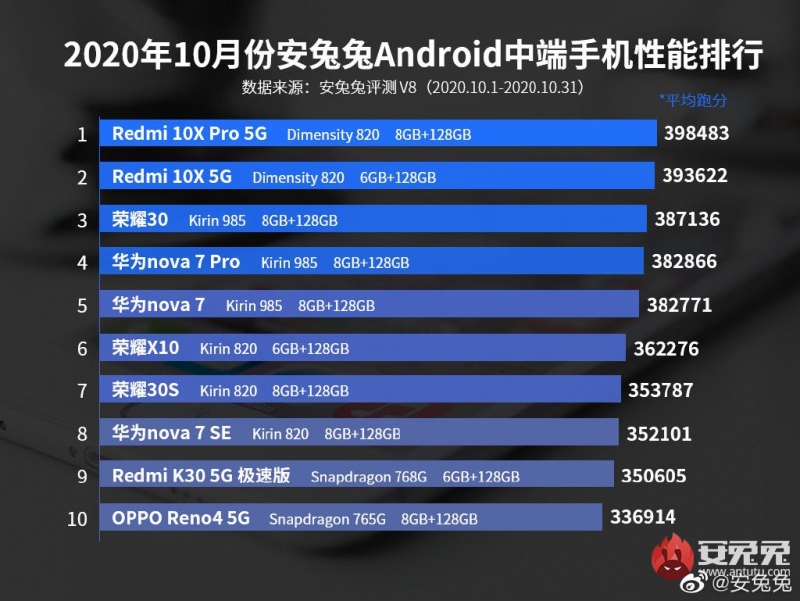 双11大促期间,Redmi 10X开启了限时闪降促销活动,让这款手机的性价比再一次提升。根据安兔兔发布的性能和性价比排名,Redmi 10X均名列榜首。Redmi 10X凭借281.4的性价比分值,在全价位手机中名列第一。