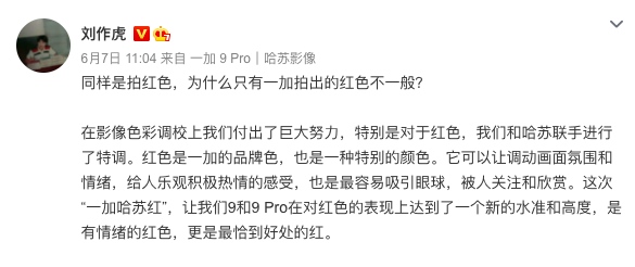 对此,一加CEO刘作虎表示:“红色是一加的品牌色,也是一种特别的颜色。它可以让调动画面氛围和情绪,给人乐观积极热情的感受,也是最容易吸引眼球,被人关注和欣赏。这次“一加哈苏红”,让我们9和9 Pro在对红色的表现上达到了一个新的水准和高度,是有情绪的红色,更是最恰到好处的红。”
