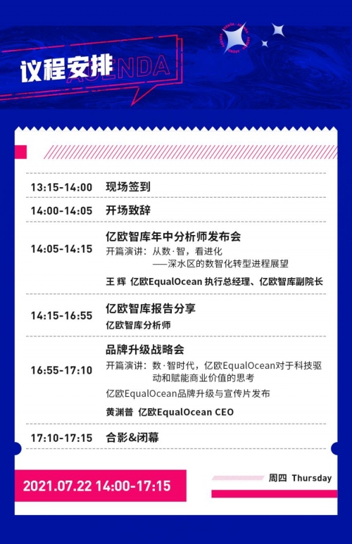 2021亿欧EqualOcean年中分析师发布会暨品牌升级战略会定于2021年7月22日(周四)下午14:00--17:15在北京·后山艺术空间(冥想空间)举行,活动全程还将开启线上直播,欢迎登陆“活动行”平台,搜索“2021亿欧EqualOcean年中分析师发布会暨品牌升级战略会”报名参与活动,期待您的关注!